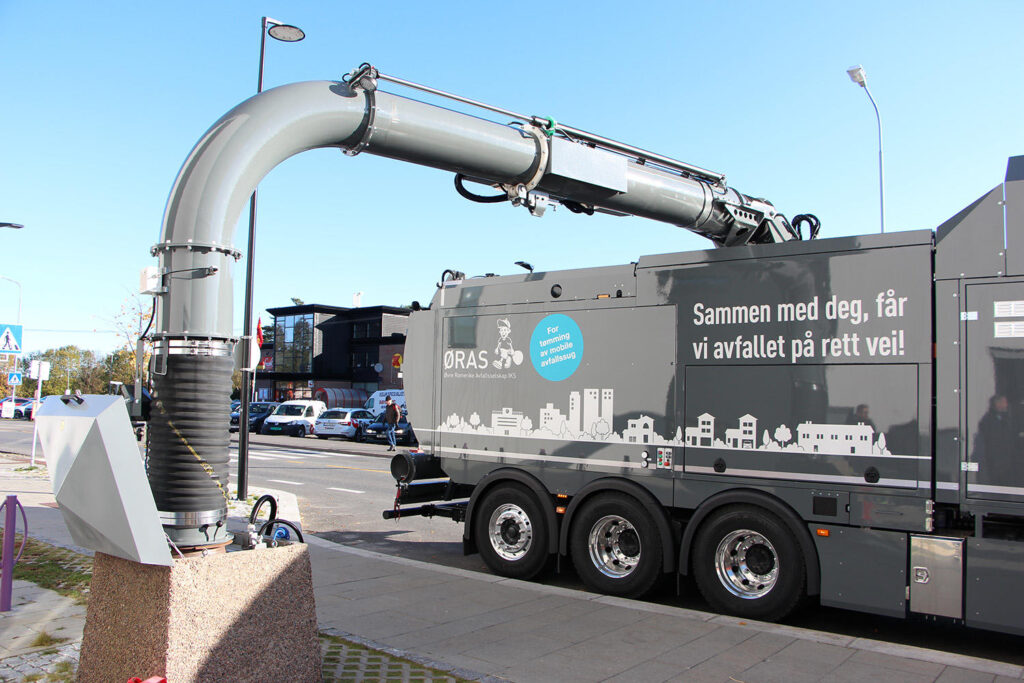 Avfallet blir transportert via rør til en sentral, hvor avfallet samles opp i store containere. Fulle containere vil senere bli tømt med en sugebil.